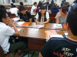 最後の質問時には多くの学生が講師の方に質問をする姿が見られ、講義は15分延長の1時間に渡る内容となりました。またワークショップでは「自分の地域に残したい物・文化は?」をテーマに、もし自分が事業を立ち上げるとしたといったシミュレーションを行いました。6人のチームとなって、企画の実現性やニーズ調査を考え、最後には各班でプレゼンテーションを行いました。