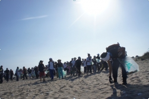 清掃最終日、清掃ルートは2つに分けられ、それぞれ200名強の学生で清掃しました。前日までの疲れも忘れ、「浜を綺麗にしたい」という想いを胸に、合流に向けて元気いっぱいにゴミを拾っていきました。午後の作業も終盤に近付き、2つの隊が合流地点であるのさか望洋荘前の浜へと辿り着きました。