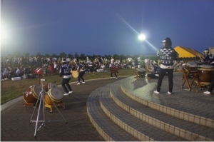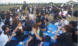 また、伝統芸能である「のさか太鼓」を披露していただき、学生は清掃の疲れも忘れ、熱気と歓声に沸きました。慰労会の最後には、430人の学生が広いグラウンドに肩を組んで大きな輪を作り、皆で今活動のテーマソングを大合唱し閉幕。慰労会へは約450人が参加し、地元の方々の計らいと学生のエネルギーで、熱気にあふれた時間を過ごすことができました。