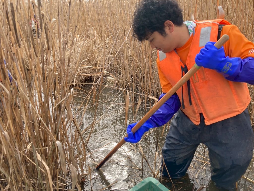 ヨシ植栽地内のオオバナは枯れて湖底に沈んでいたのでレーキを使い掻き出し、浮いたオオバナをたも網などを使い回収することで除去しました。