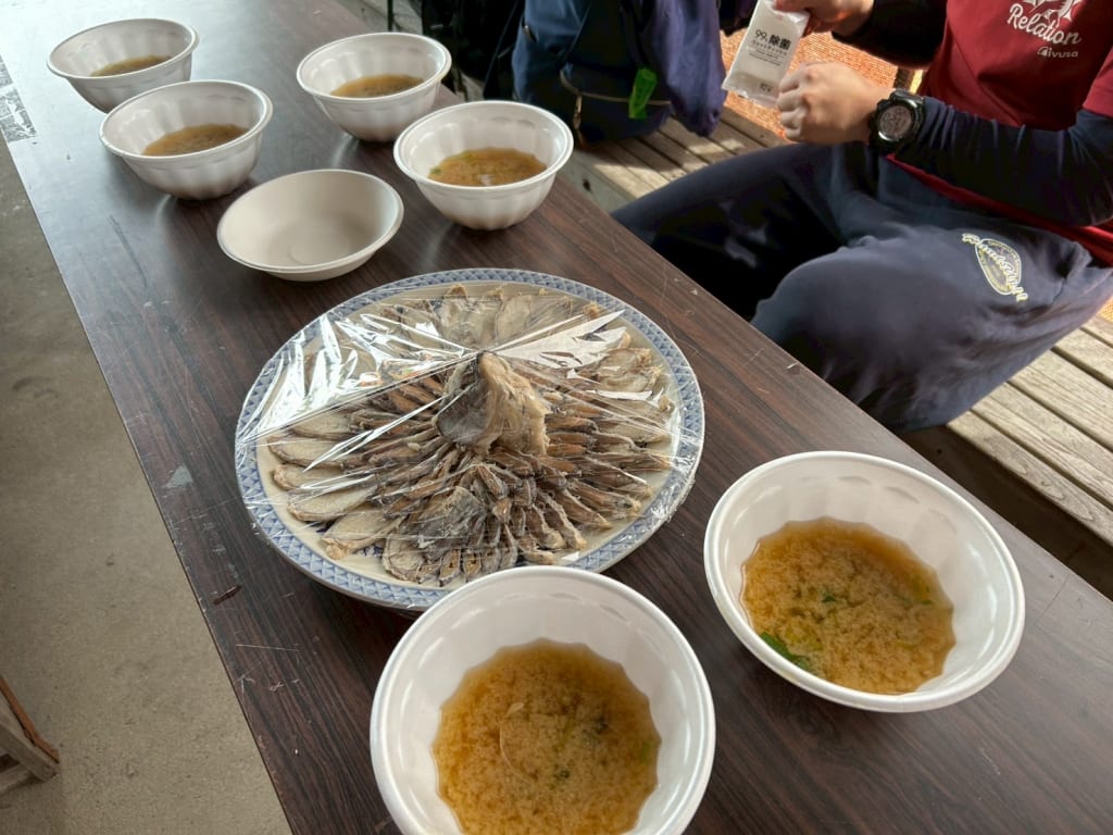 昼ご飯は、漁師さんが捕った琵琶湖の鯉をびわこ豊穣の郷の方々が調理して、あら汁をふるまってくださいました。また古来より親しまれている鮒寿司も頂きました。