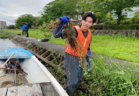 今回は瀬田町漁業協同組合主催で定期的に行われている瀬田川流域クリーン作戦に参加しました。活動場所である瀬田川は生態系が豊かで、多様な在来生物(魚介類はニゴロブナやセタシジミなど、水草はセンニンモ、クロモなど、その他鳥類や昆虫類)が生息しています。しかし外来水草オオバナの繁茂が深刻な問題となっています。