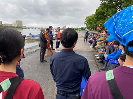 はじめに開会式が行われました。大津市の佐藤健司市長から、「今年度初の瀬田川クリーン作戦に参加いただきありがとうございます。IVUSAの皆様も、これまでもオオバナの駆除に取り組んでいただいていますが、このような新しい交流が生まれたことを大変うれしく思っております。今年は国民スポーツ大会が滋賀県で開催され、瀬田川ではカヌーがあります。全国から選手関係者の方が来られるので、そういった視点からも是非お力添えいただければと思います」と激励のご挨拶を頂戴いたしました。