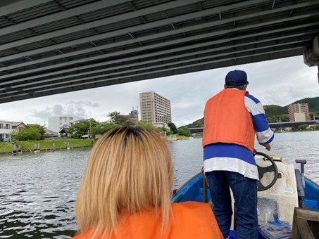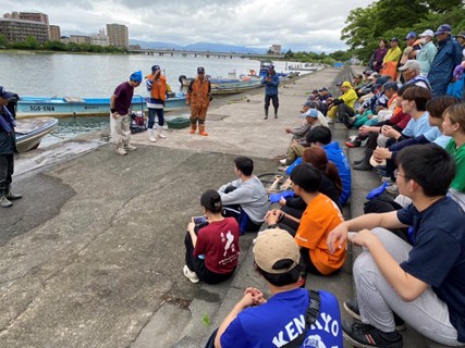 参加者は、瀬田川の多地点に群生しているオオバナのもとへ、漁師さん方の船10隻に、3名ずつ乗船させていただき向かいました。瀬田川では前日にごみの回収作業も行っていたらしく、とても綺麗でした。