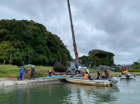 抜き集めたオオバナは学生から漁師さんへと渡し、一旦船上へと引き上げ、溜まってきたタイミングで集積所へと運びクレーンでブルーシートの上へ移動させました。除去したオオバナは漁師さんの協力のもと焼却所へ運び焼却処分されます。