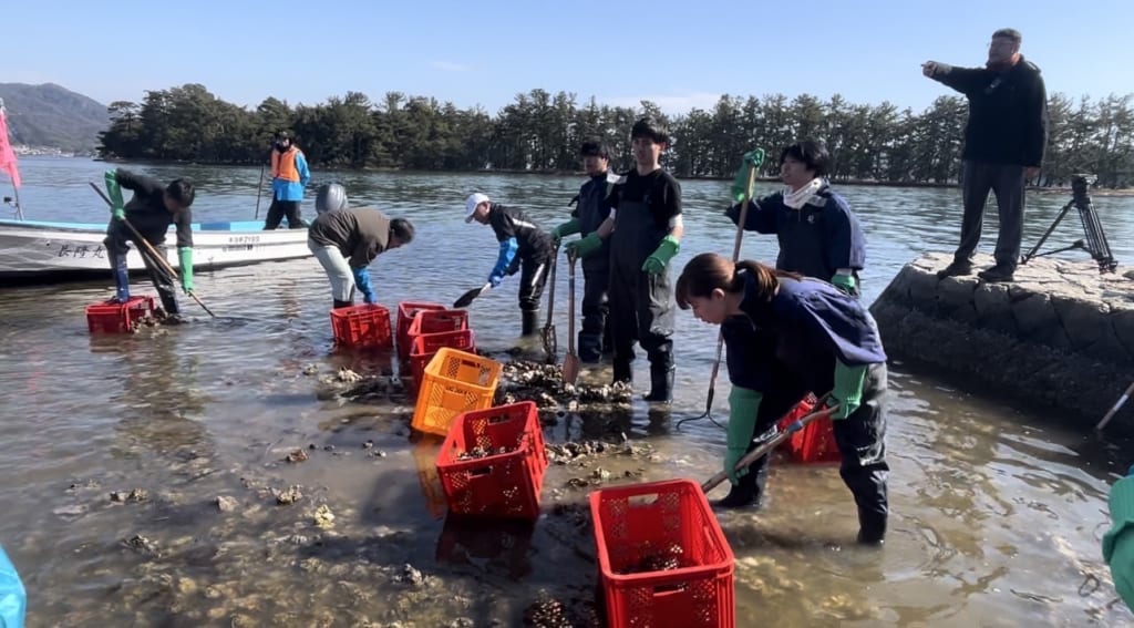 そこで私たちは、学生のマンパワーで堆積したカキ殻の回収を行うとともに、地域住民が主体的に阿蘇海の環境保全に取り組める関係づくり(産官学民の連携強化)を目指し、「カキ殻拾うday」を実施しています!