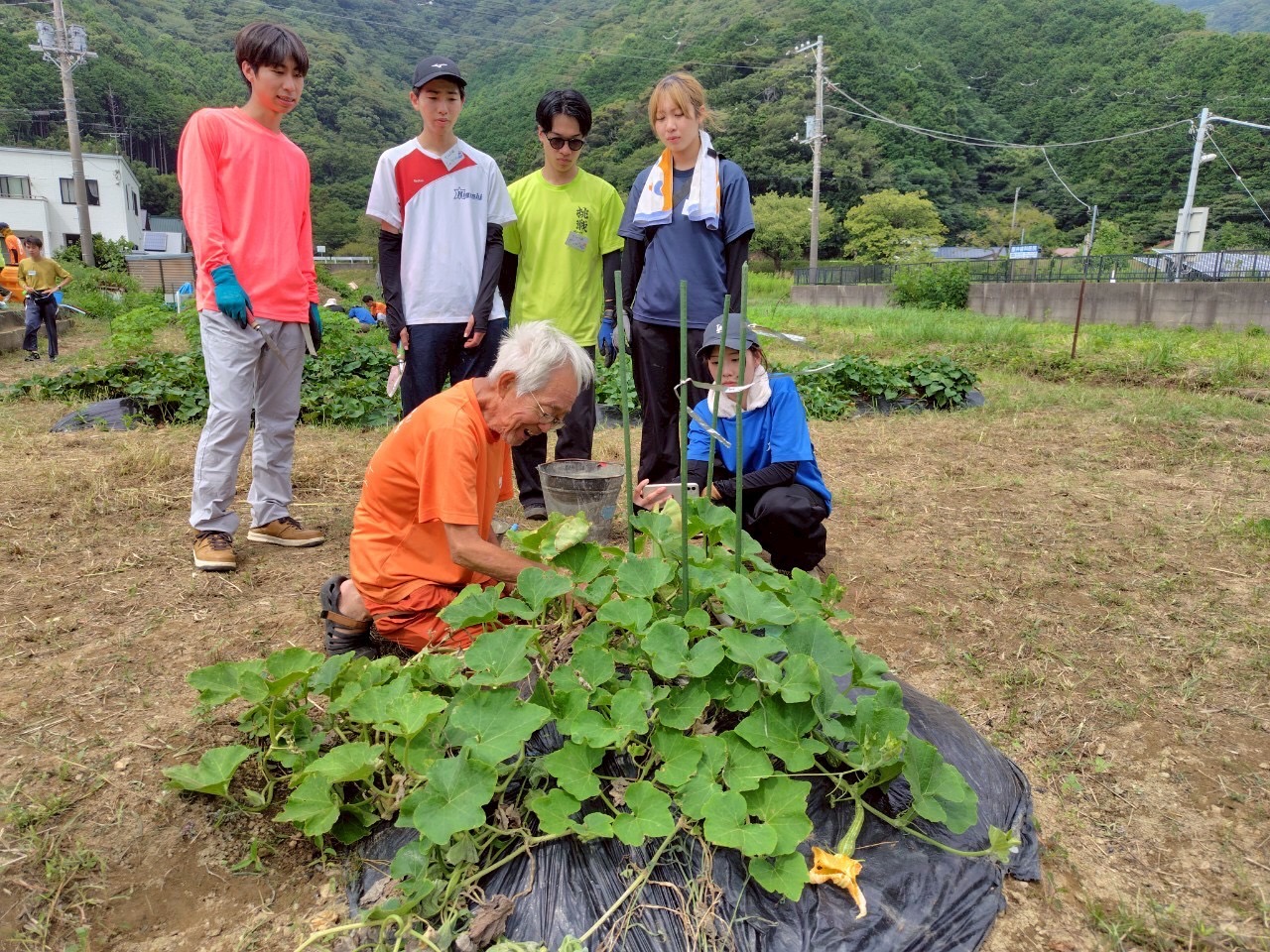 畑作業組は、午前中に作物への水まきや追肥、防獣ネットを張る等の作業を行い、午後には指導いただいている藤原國男さんからレクチャーをいただきました。厳しい暑さの中でしたが、学生同士で役割を分担しながら無事に今回の目標の一つである畑作業を完遂しました。
