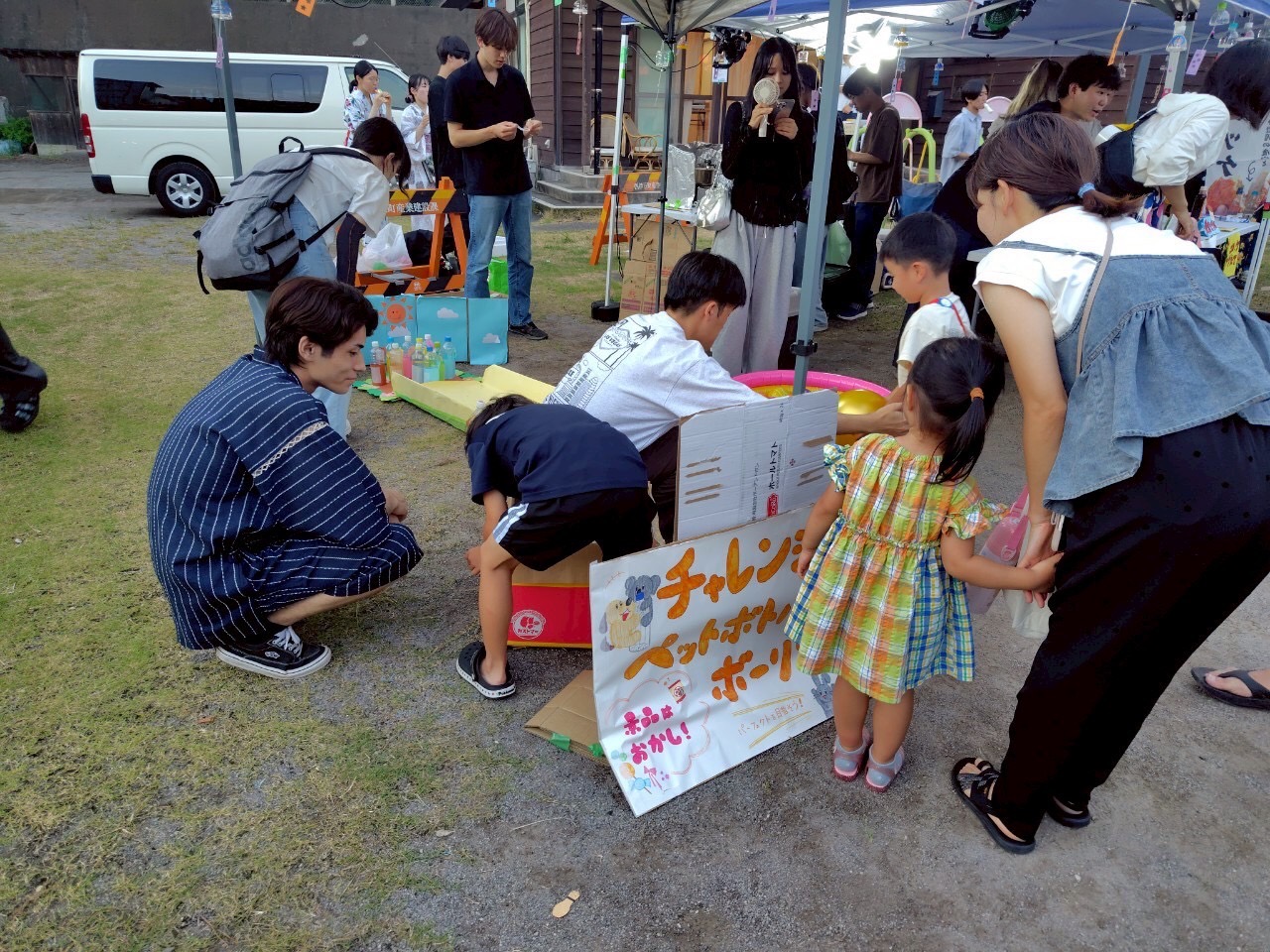 活動3日目は、いよいよ開催される夏祭りに向けて午前は引き続き準備をしました。2日目に準備したブースの道具やペットボトル風鈴などの装飾を屋台に備え、最後の準備が完了しました。17時から安良里夏祭りが始まり、出店したペットボトルボウリングやヨーヨー釣りには、たくさんの子供たちが訪れていました。