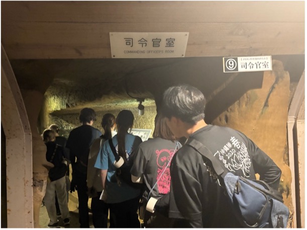 2日目は、沖縄戦の歴史を深く学ぶ平和学習を実施しました。まず、沖縄戦海軍の司令部が置かれていた旧海軍司令部壕を訪れました。壕内の薄暗い通路を進み、壁に残る爆撃の跡や当時の人々の生活を物語る展示品に触れることで、戦争の実態を実感しました 。