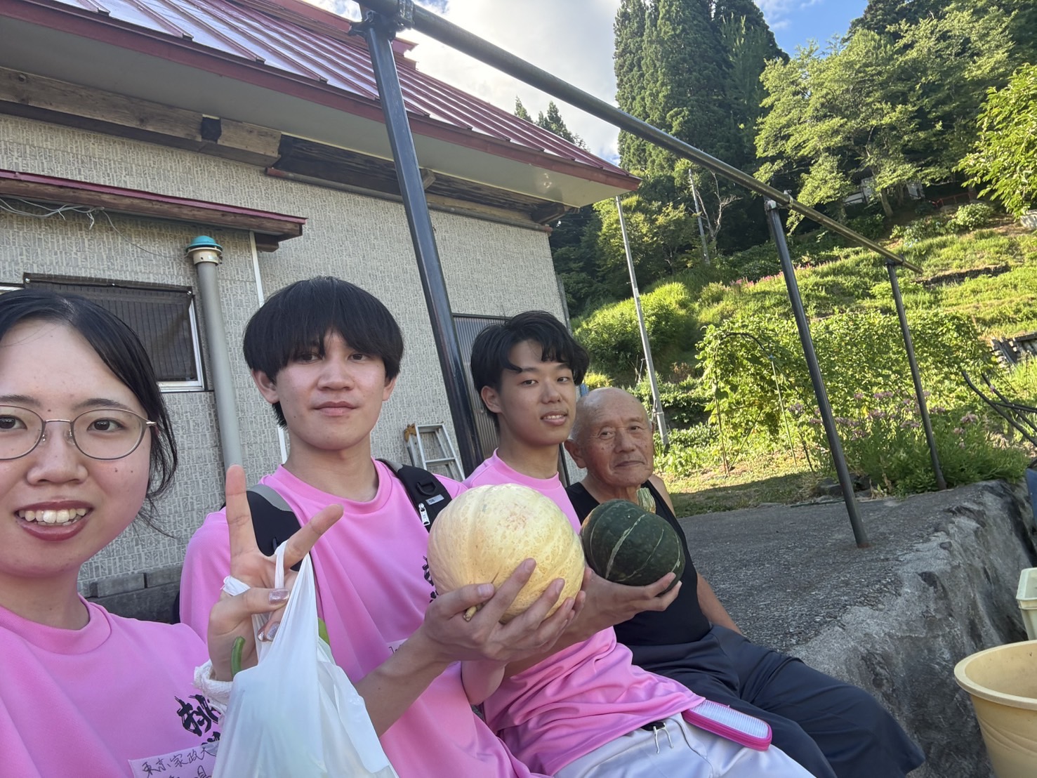 孫の手ボランティア(お困りごとのお手伝い)は、「庭の草刈り」「農作物の収穫」などを行いました。また、お子さんの夏休みの自由研究のお手伝いを手伝って欲しいというご依頼があったため、そのお手伝いもさせていただきました。お困りごとがないか、ご自宅を一軒ずつ訪問させていただいた際に、お茶や果物をいただきながらお話させていただくこともありました。地域の方とお話しさせていただく時間は、とても貴重な時間となりました。