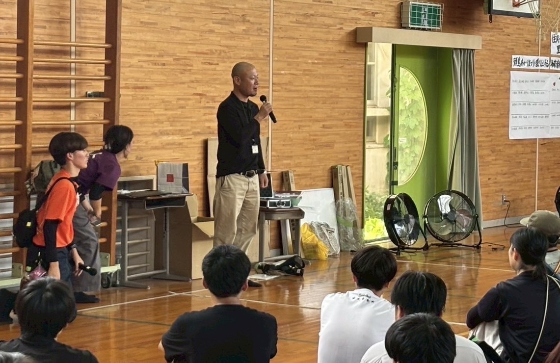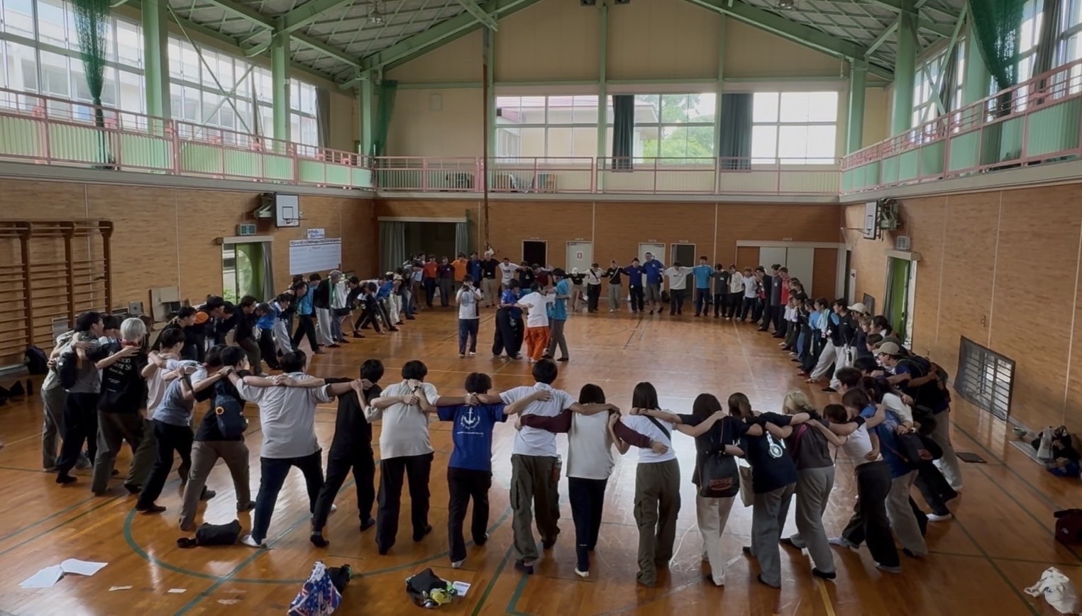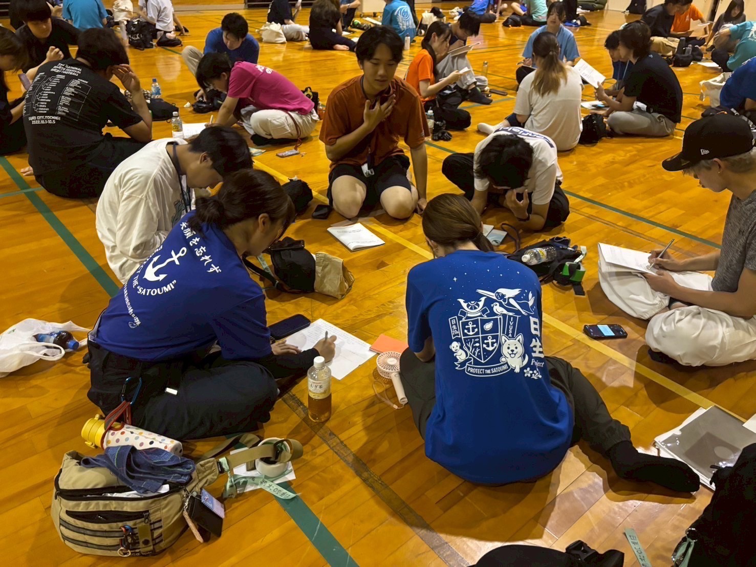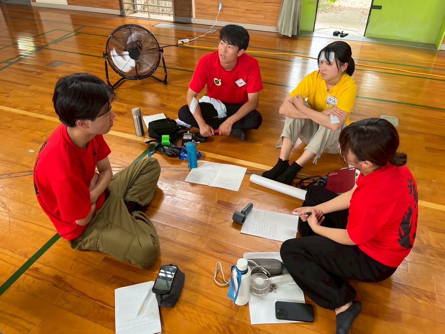 初日の活動では岡山県備前市日生町内の頭島に到着後、旧日生南小学校で行われた開会式では、備前市産業振興課の森谷文彦さん、中谷絵美さん、頭島あかりまつり実行委員長である片倉弘貴さんと、松崎啓三さんにお越しいただき、ご挨拶をいただいた後、最後に皆で円陣を組み、気持ちを一つにして活動へのモチベーションを高めました。