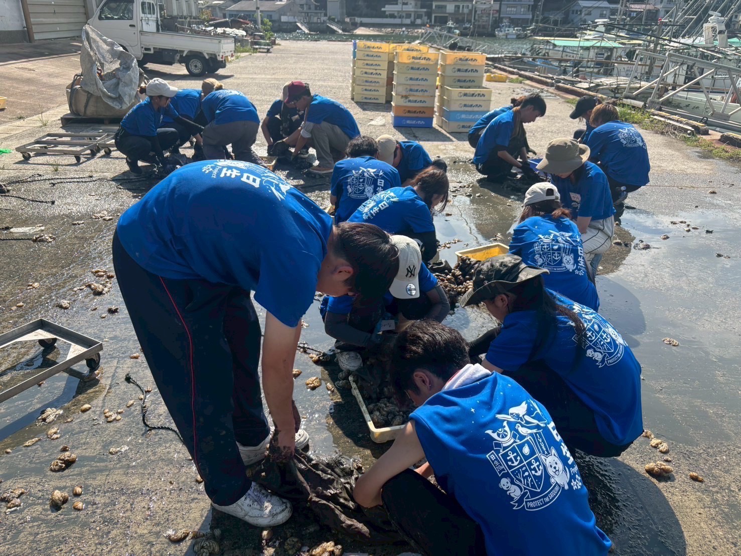 午後からは地元の漁師さんと里海保全活動と地域の方との交流会を行いました。里海保全活動ではアマモの種まきと粉砕した牡蠣殻の分別を行いました。牡蠣の成育の助けになるアマモの生息域を広げることで里海保全に貢献しました。