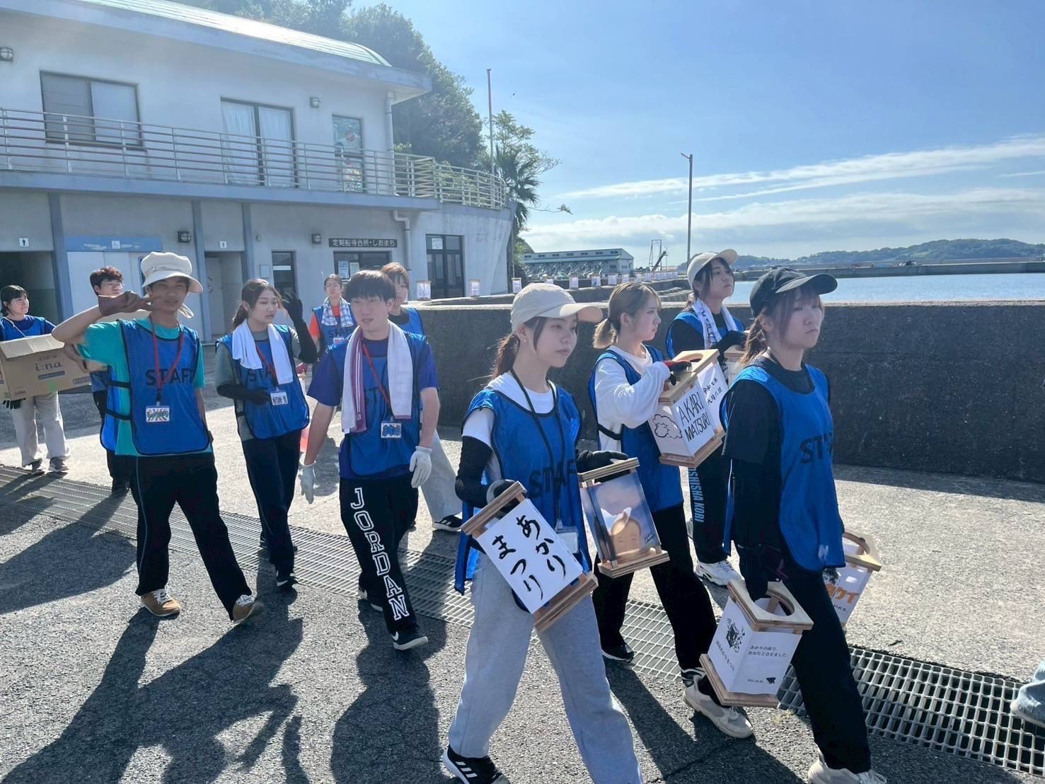 また、日生町漁業協同組合頭島支所前ではチヌ(クロダイ)カレーの出店も行われ、合計で73食を提供しました。会場には多くの来場者の方が立ち寄り、チヌを使った料理を味わいながら交流する姿が見られ、賑やかな雰囲気に包まれました。頭島あかりまつりを通して、地域の方々から「頑張ってね」や「お疲れ様」といった言葉をかけていただき、地域の温かさを感じるとともに、活動に対する活力となりました。