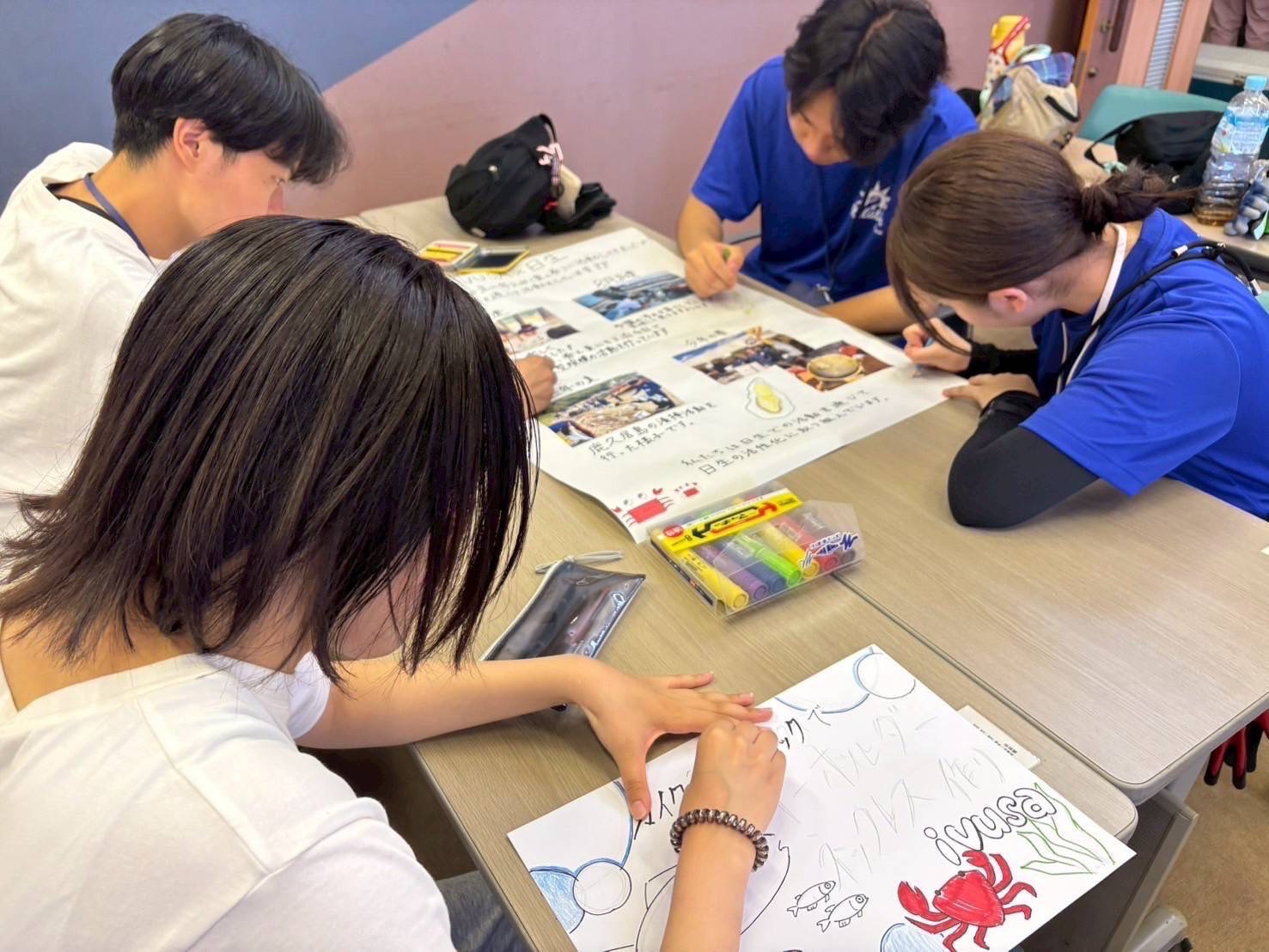 2日目の午前は外輪海水浴場にてワークショップ用のマイクロプラスチックを採取し、日生町漁業協同組合頭島支所では活動を紹介するポスターの作成を行いました。このポスターはブースに展示するもので、漁師さんの取り組みやIVUSAと里海との関わりについてもまとめました。ワークショップブースでは、マイクロプラスチック問題についての啓発を行い、里海を守ることに繋げることを目的として実施しました。