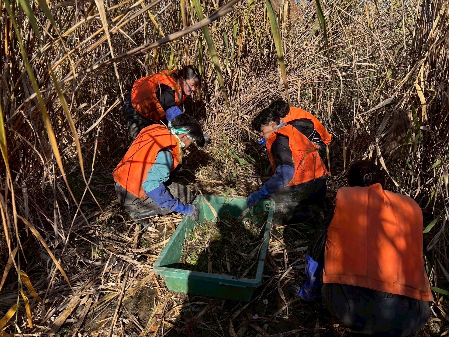 12月6日に、滋賀県守山市の赤野井湾のヨシ植耕地にて特定外来生物オオバナミズキンバイ(以下オオバナ)の除去活動を実施しました。玉津小津漁業協同組合9名、認定NPO法人びわこ豊穣の郷2名、IVUSA学生18名、計29名が参加しました。