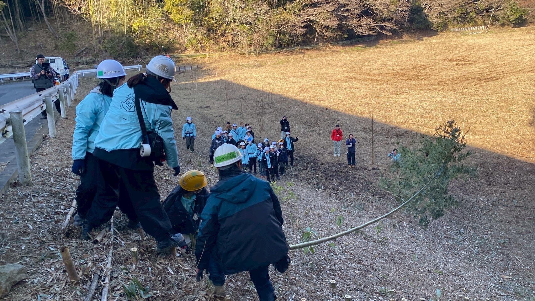 午前は、IVUSAの森側ではガードレール脇の竹の全伐採を目指して作業しました。斜面での作業に苦戦する部分もありましたが、協力して安全に伐採を進めました。