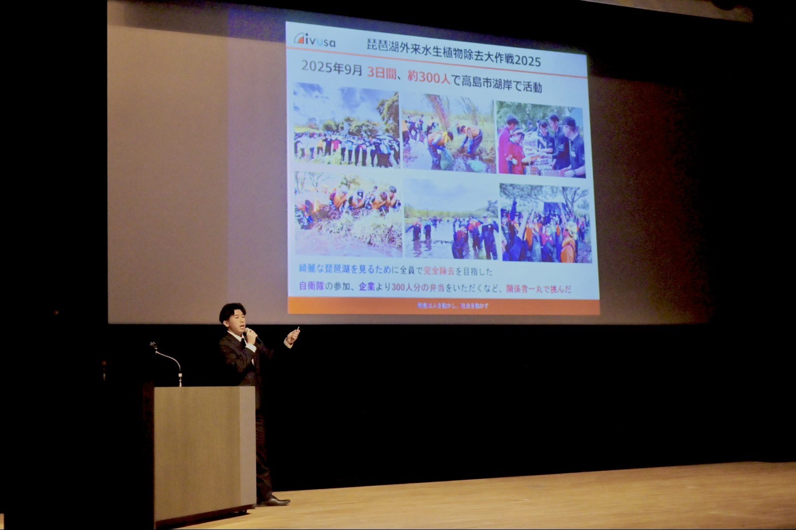 また徳力煌陽からは琵琶湖のオオバナミズキンバイ除去活動で行政、漁師、地域NPOの方々と連携して取り組み、世界湖沼会議などで各国からユニークな取り組みとして評価されている事を紹介しました。更に2025年の夏に3日間、約300人で開催した「琵琶湖外来水生植物除去大作戦2025」の活動報告も行い、自衛隊や企業と協力して取り組んだことを発表しました。