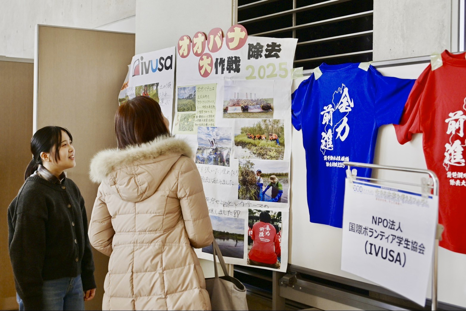 展示ブースでは、「琵琶湖外来水生植物除去大作戦2025」についての展示を行いました。多くの方が足を止めてくださり、学生の熱意の高さに関心をいただいたり、企業の方々が一緒に活動ができたらと名刺交換をしてくださったりしました。