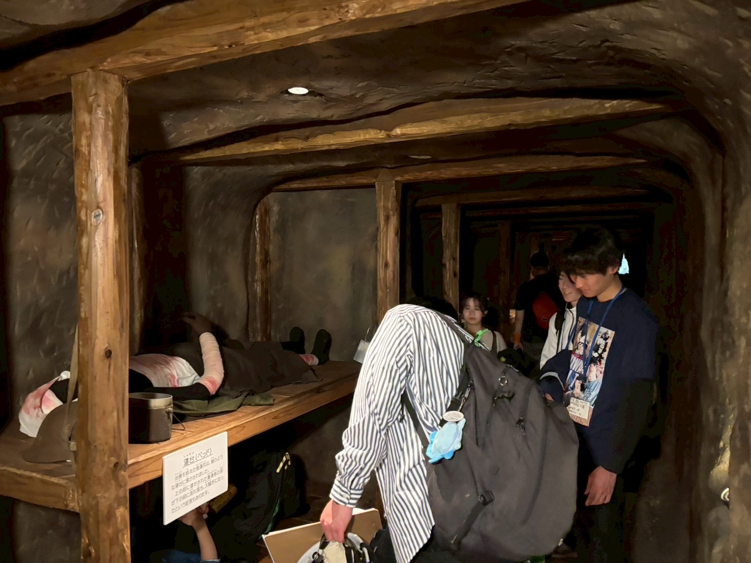 続いて訪れた南風原文化センターや一中学徒資料館では、再現された陸軍病院壕の寝台や当時の教科書、帽子などの遺品を目の当たりにし、実際の病院壕の跡地では、空気が重くこもっており、思わず息苦しさを覚えるほど当時の厳しさが伝わってきました。
