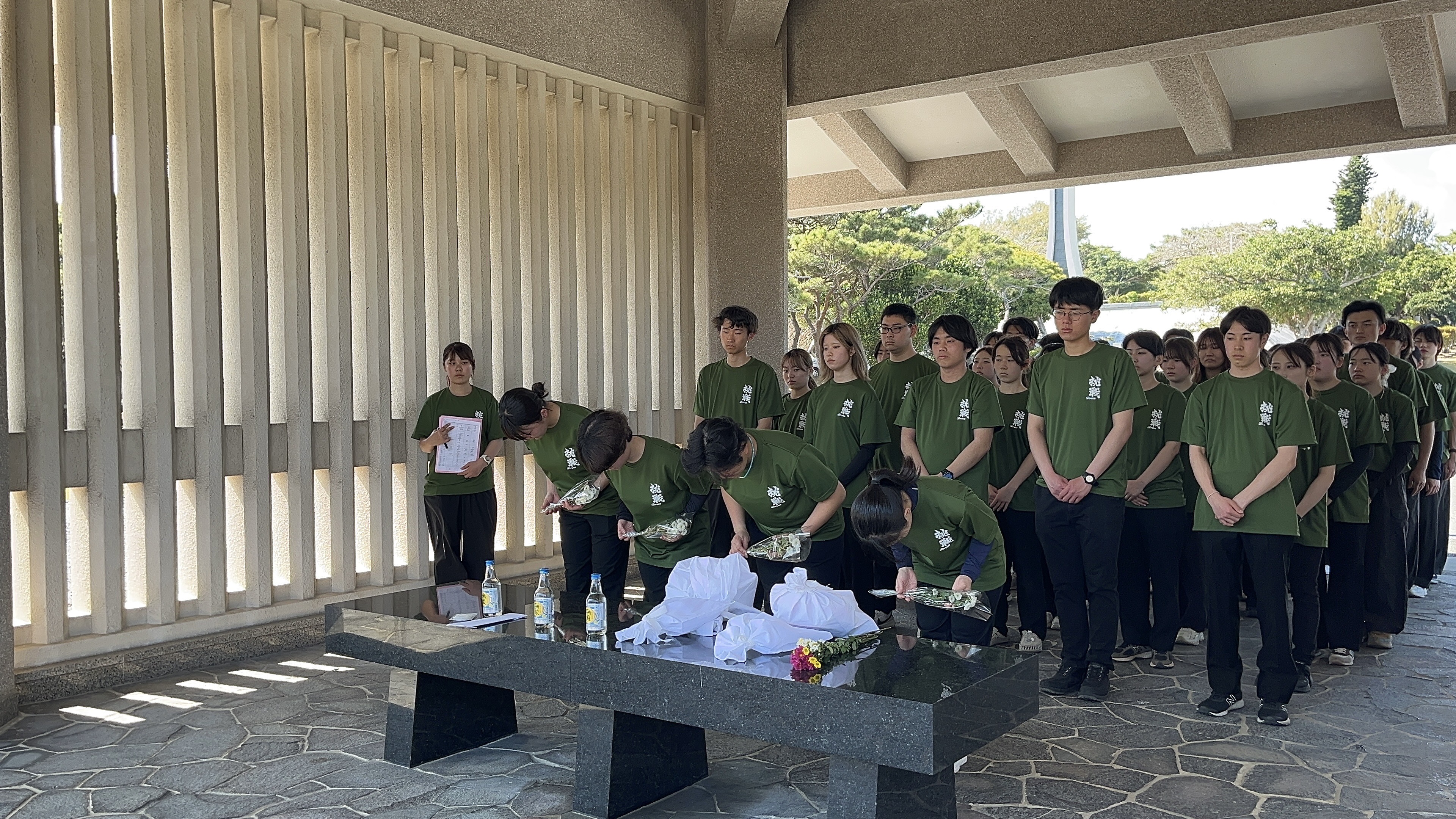 午後には、沖縄県平和祈念公園内の国立沖縄戦没者墓苑にて慰霊式を執り行いました。数日間にわたる遺骨収集や平和学習を通じ、戦没者が置かれた環境やご遺族の歩みに接してきた背景を踏まえ、慰霊式に臨みました。先の大戦で亡くなられたすべての方々に対し、深い哀悼の意を捧げました。