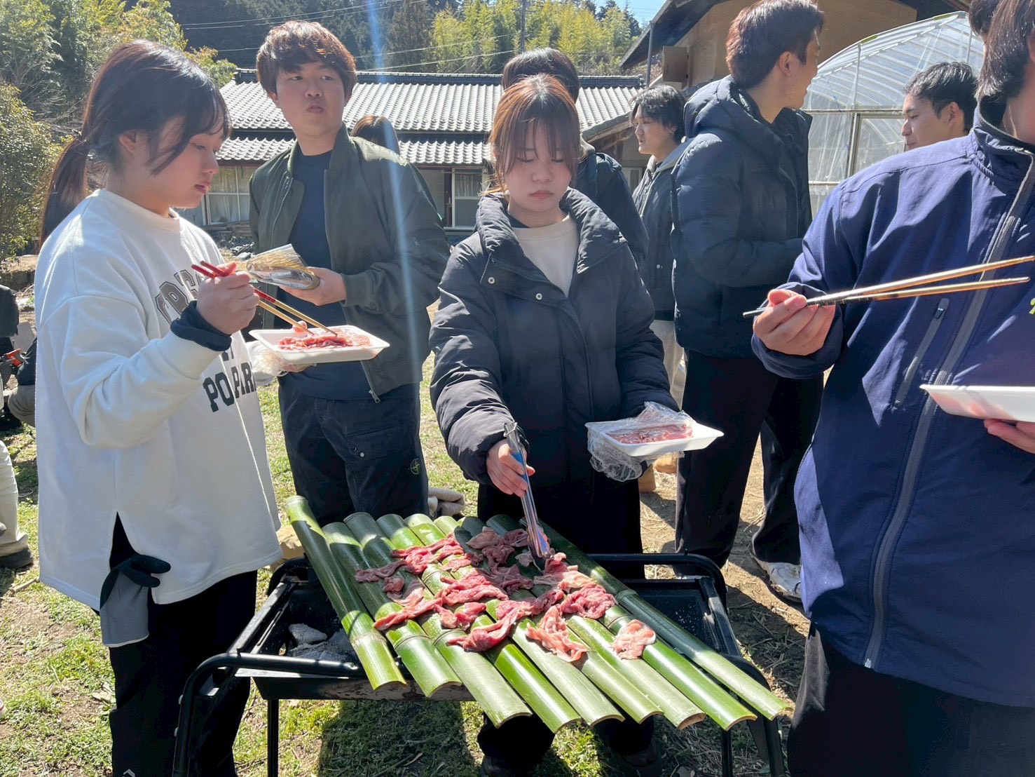 その後、百田ベースにて、竹林整備で切り出した竹を活用した竹網BBQを実施しました。学生同士で交流し、楽しみながら竹の無限の可能性を感じることができました。
