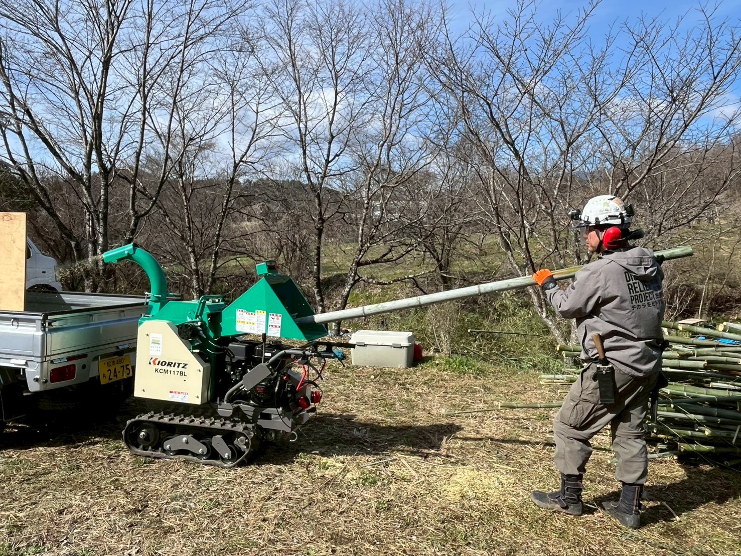 初日は、現地に到着後、安全に作業を進めるために講習や準備体操をしてから竹の伐採を開始しました。鈴岡城址公園にて、各班で分かれて作業をし、伐採した竹を竹チップにしました。竹チップとは、竹をチッパーで細かく粉砕したもので、雑草への抑止効果があることから除草シートとして雑草が生える土地に敷くことで草刈り作業が軽減されるものです。