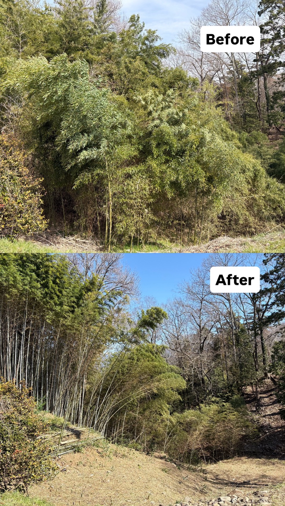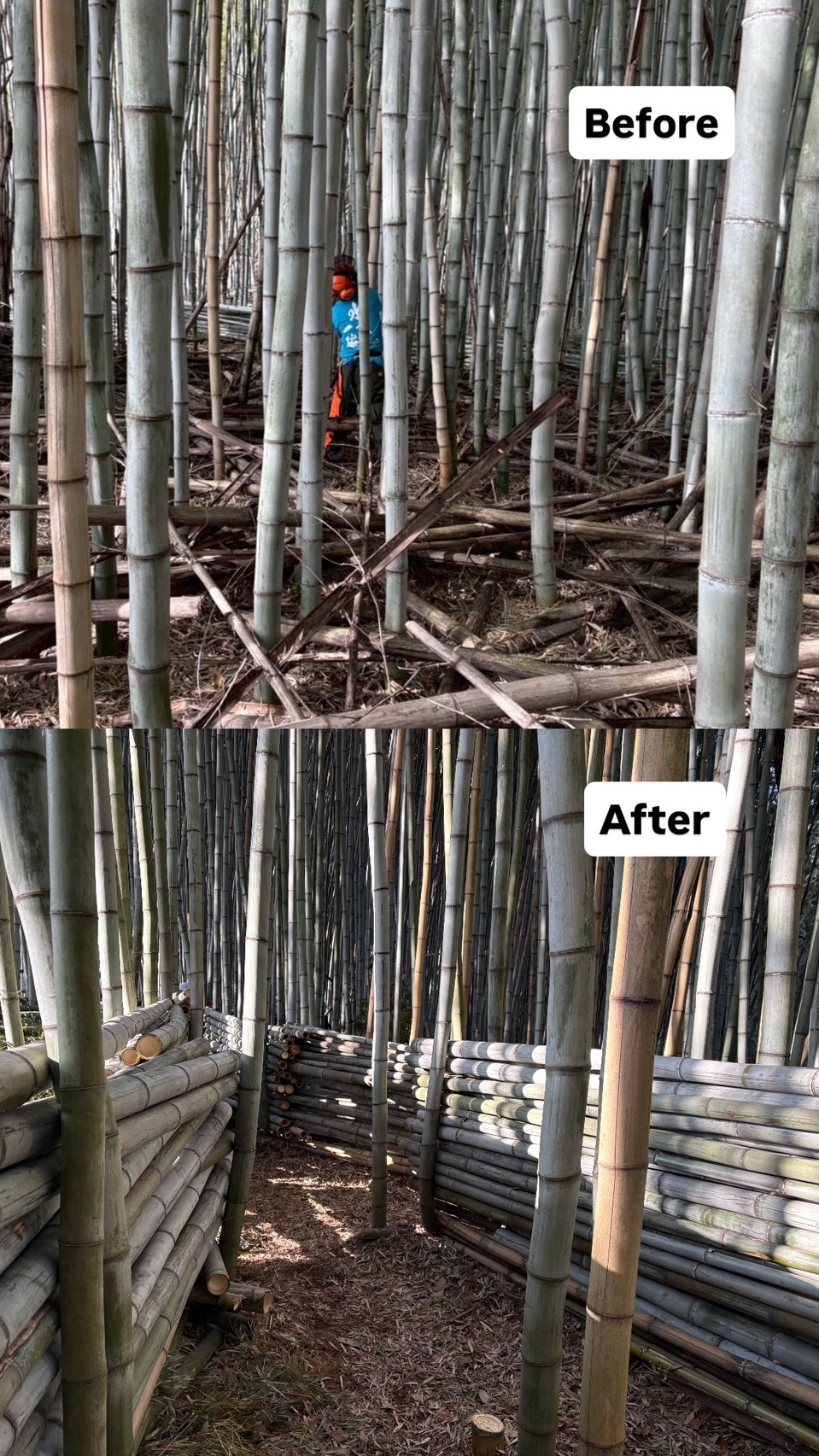 いなだに竹Linksを始めとする地元の方に竹の切り方のコツなどを教えていただいたり、初めて参加する地元の高校生に道具の使い方を教えたり、世代を超えた多くの方々と交流することができました。2日間の作業を終え、竹林の全伐、竹林を利用した迷路は完成することができました。