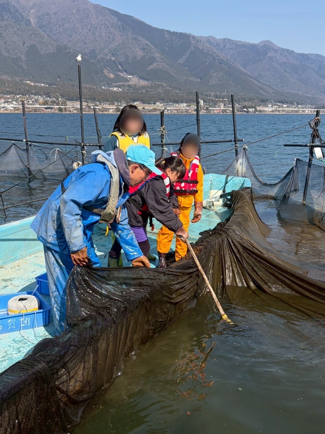 そして漁体験を行いました。漁師の駒井さん指導のもと、実際に琵琶湖へ出て伝統的な漁法である「エリ漁」を見学しました。エリ漁とは琵琶湖で1,000年以上続く伝統的な小型定置網漁法です。