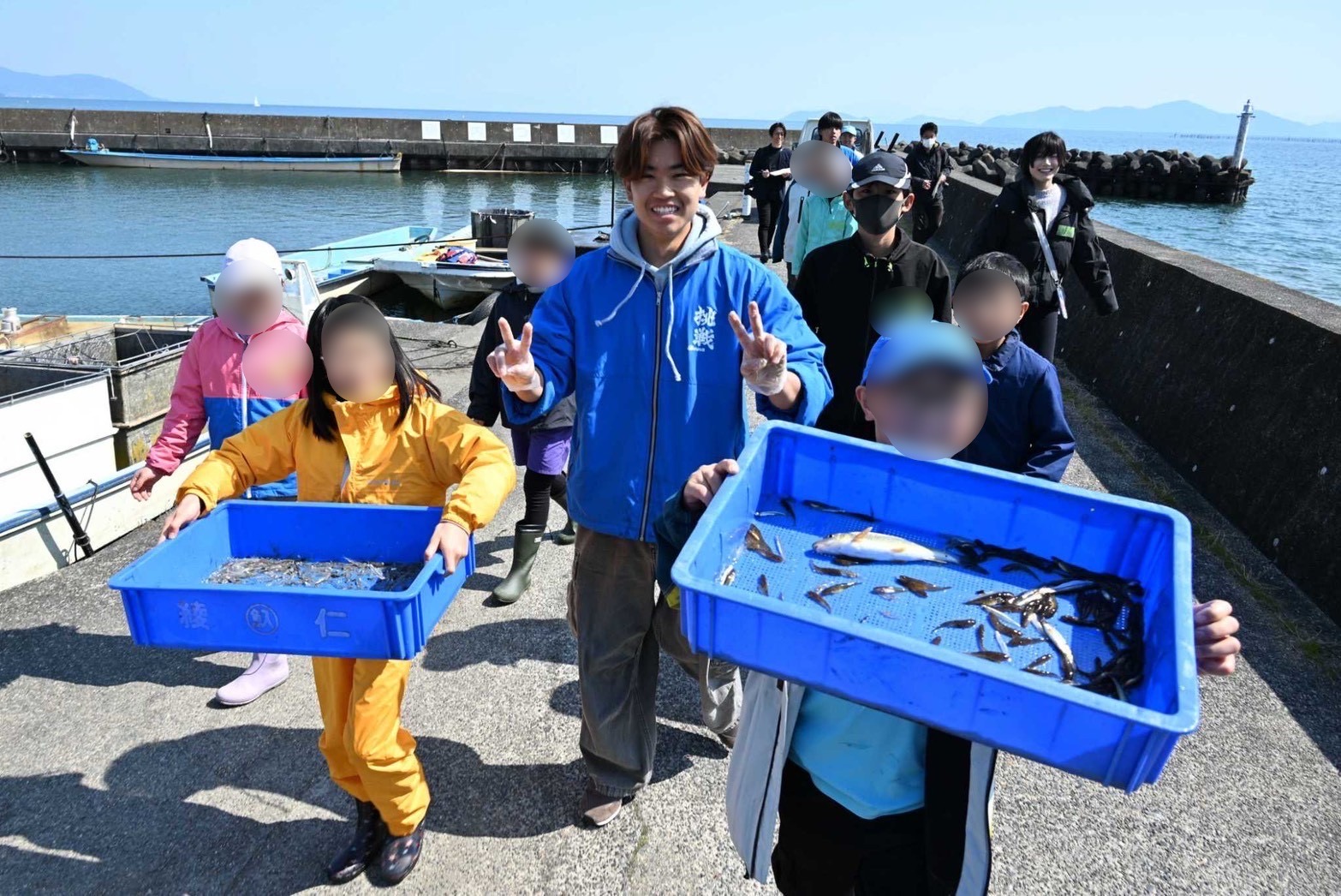 当日は天候にも恵まれ、子どもたちはタモで網にかかったホンモロコやニゴイ、イサザ、ヒオウを捕りました。漁港では水槽観察用の魚と昼食用の魚を選別しました。
