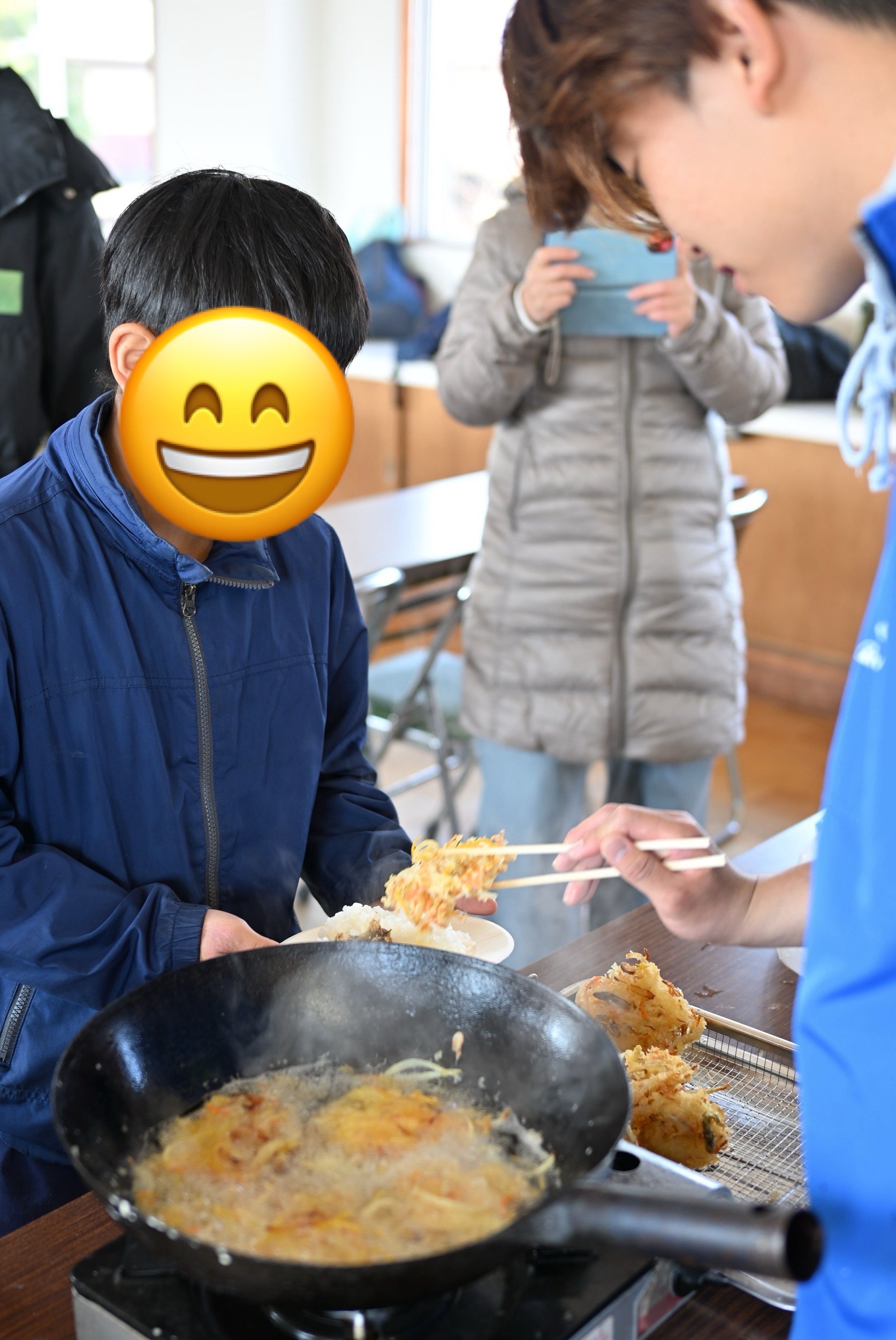 昼食は、漁体験でとれた湖魚を用いて調理しました。メニューはニゴイのかあら汁、ホンモロコの佃煮、イサザのかき揚げといった湖魚を活かした内容となりました。子どもたちは美味しそうに湖魚料理を楽しみ、沢山おかわりをする姿も見られました。