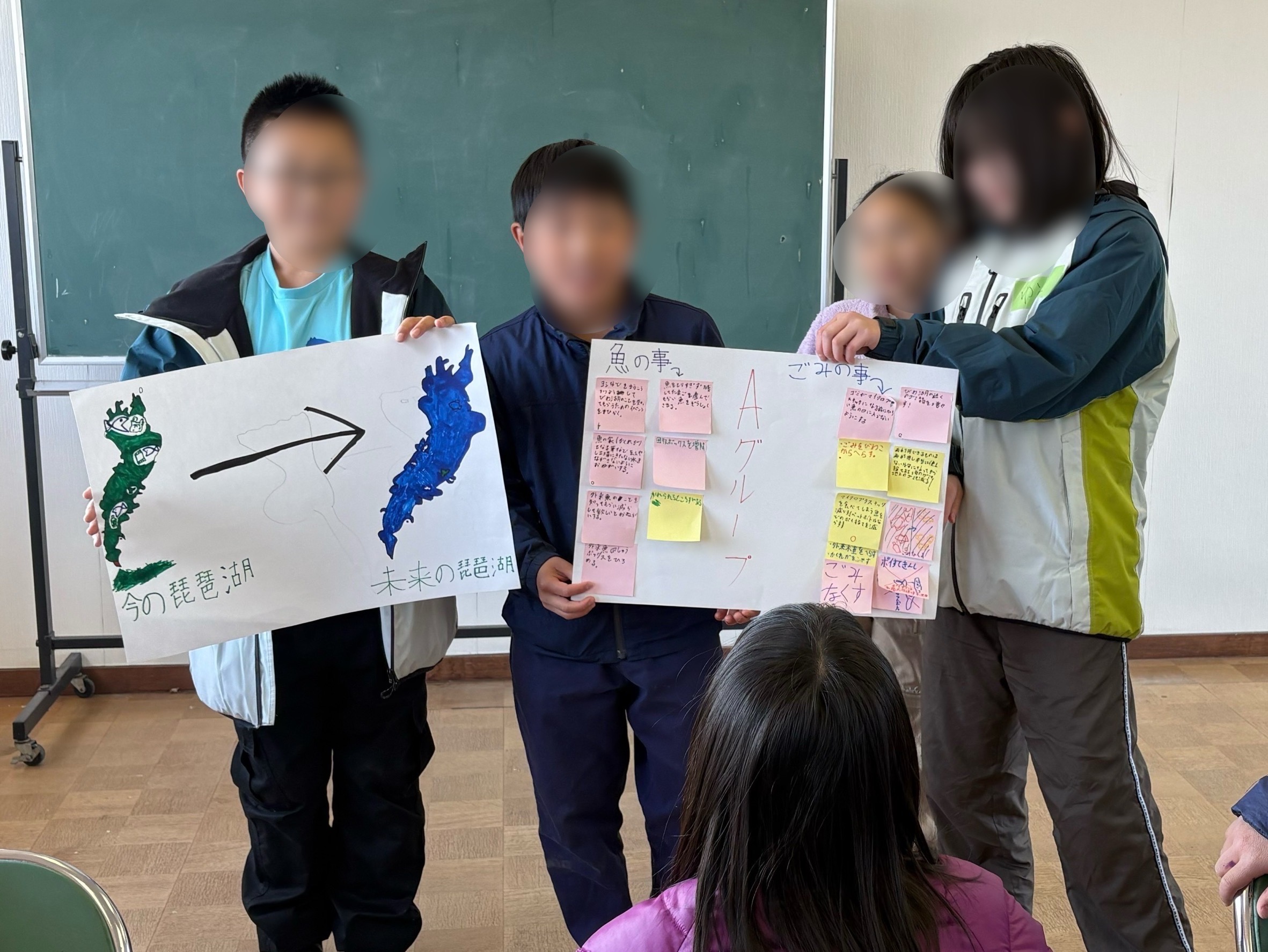 午後は、午前の体験をもとに湖魚が住みやすい琵琶湖の環境づくりについてグループで話し合いました。アイディアを付箋に書き出し、一枚の模造紙にまとめて全体で発表しました。「ヨシを増やして湖魚が住みやすい琵琶湖づくりをしたい」「ポイ捨てをなくすためにゴミ拾い大会をする」など環境に関する意見から、「外来魚を釣って回収ボックスに入れる」などの外来種に関する意見など様々な観点の意見が出され、とても有意義な時間となりました。