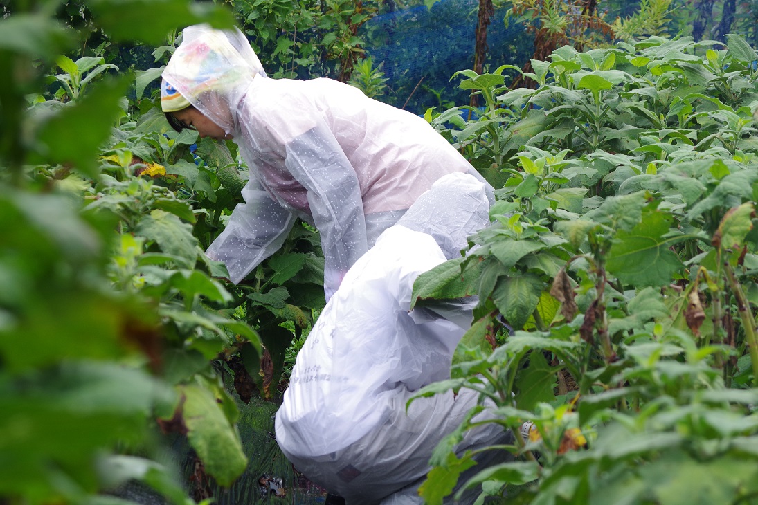 午後は第1再生休耕田にて、ヤーコン畑の手入れ作業をしました。ヤーコンの葉が1.5メートルほどに成長しており、これから実が肥大化させるために追肥と雑草抜きをしました。